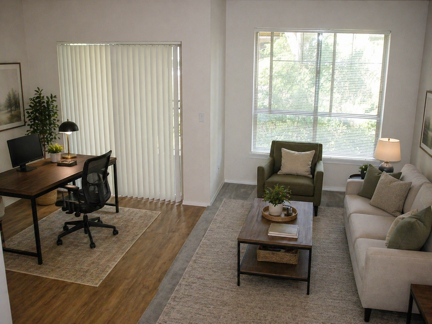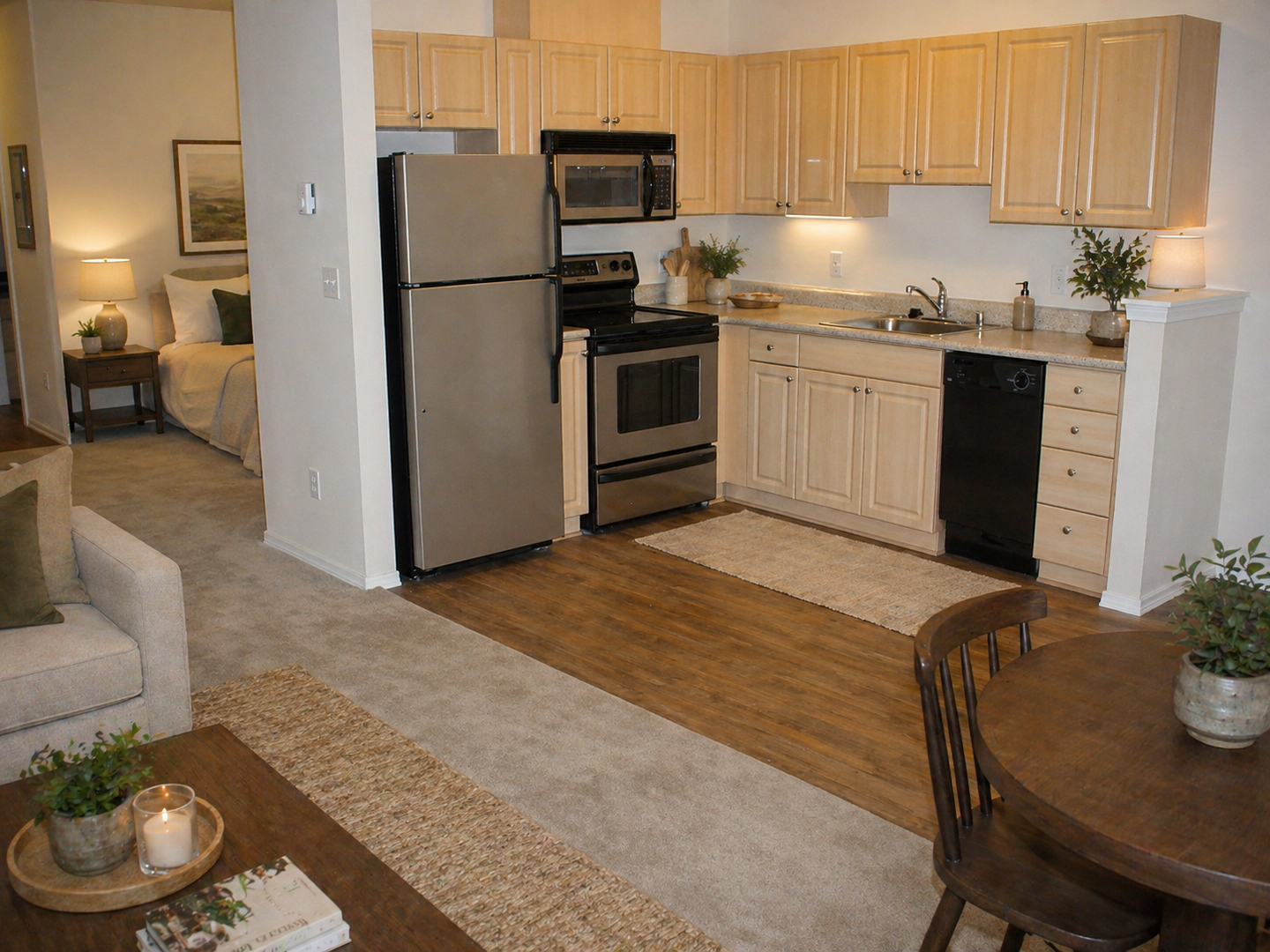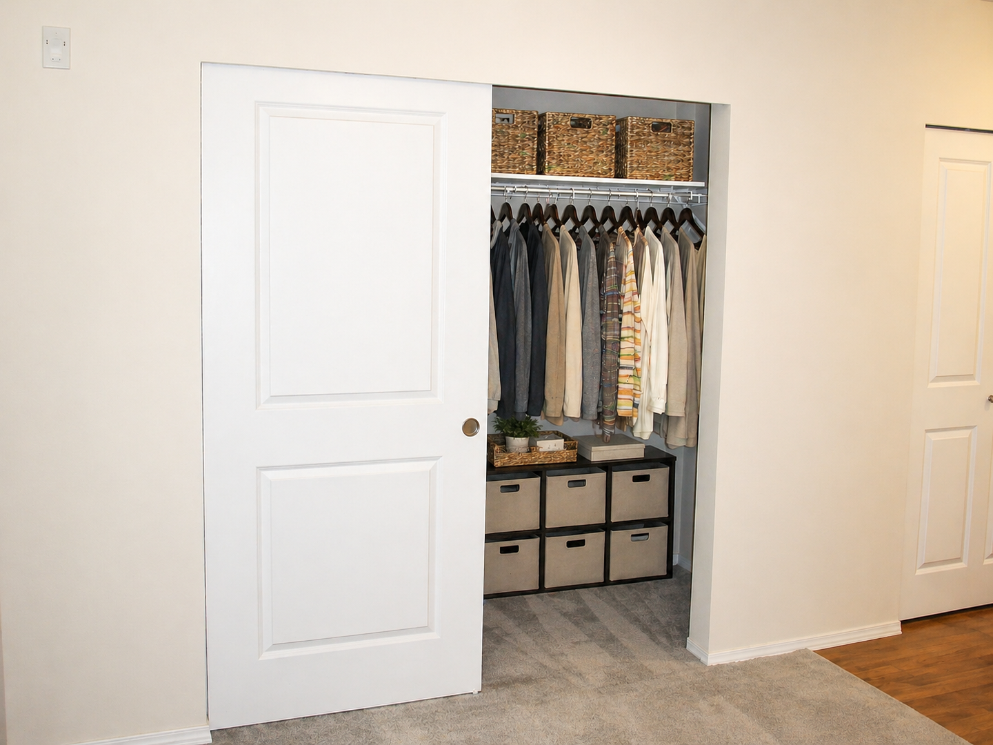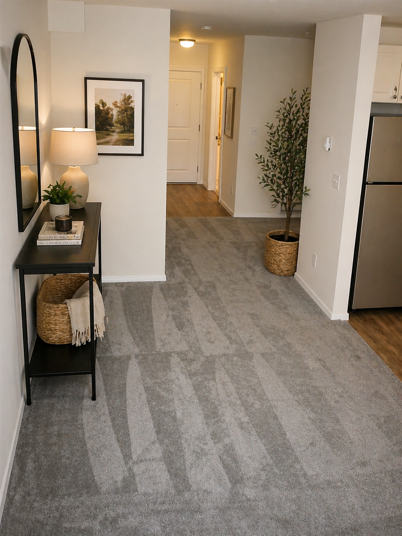 Interior: Beige color scheme with carpet & hardwood flooring