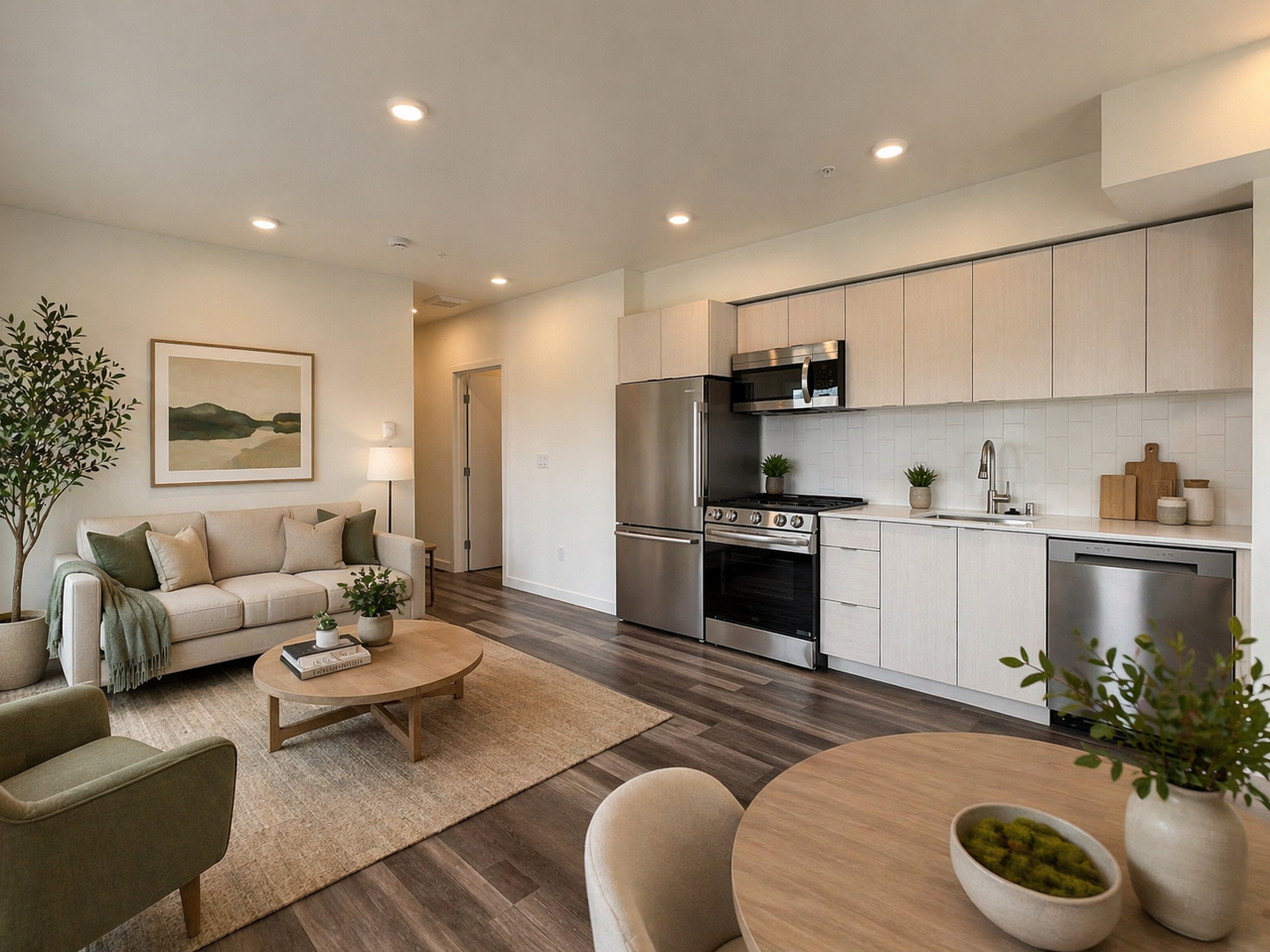 The kitchen is fully equipped with new stainless steel appliances, including a dishwasher, full-size oven/range, and refrigerator, everything you need for easy, modern living. Private balcony, ideal for enjoying neighborhood views or unwinding after a long day. For your convenience, the unit also includes an in-unit washer and dryer.