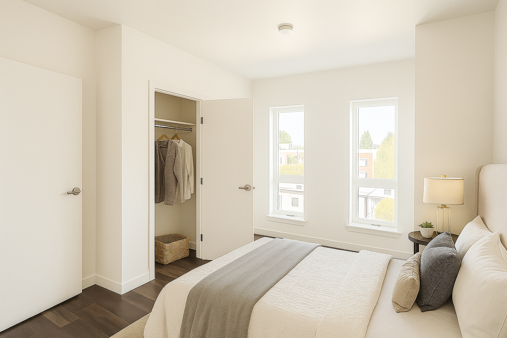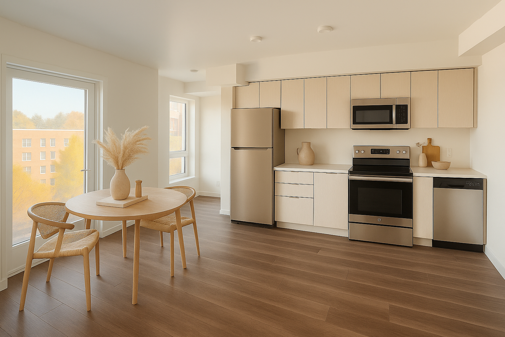These Studio & 1 Bed/1 Bath apartments feature a sleek, contemporary design, complete with luxury plank flooring, beautiful quartz countertops, and large west-facing windows that flood the space with natural light.