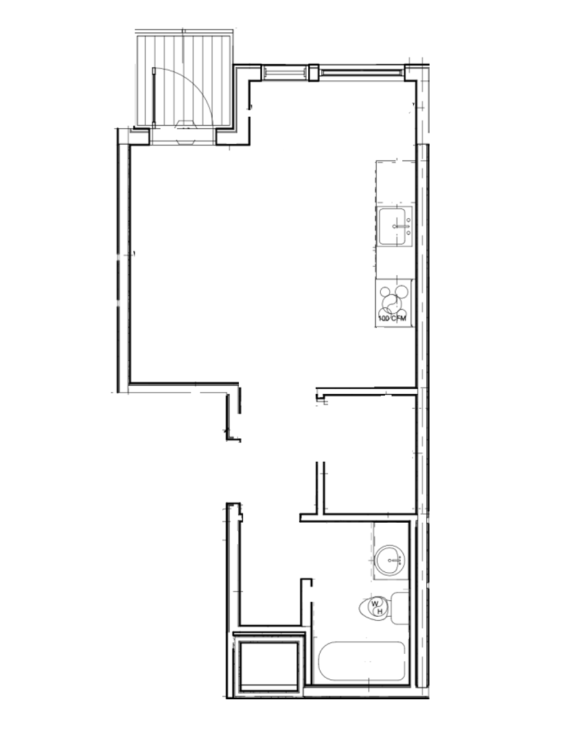 Studio apartment featuring a sleek, contemporary design, complete with polished concrete floors, quartz countertops, and large north-facing windows.
