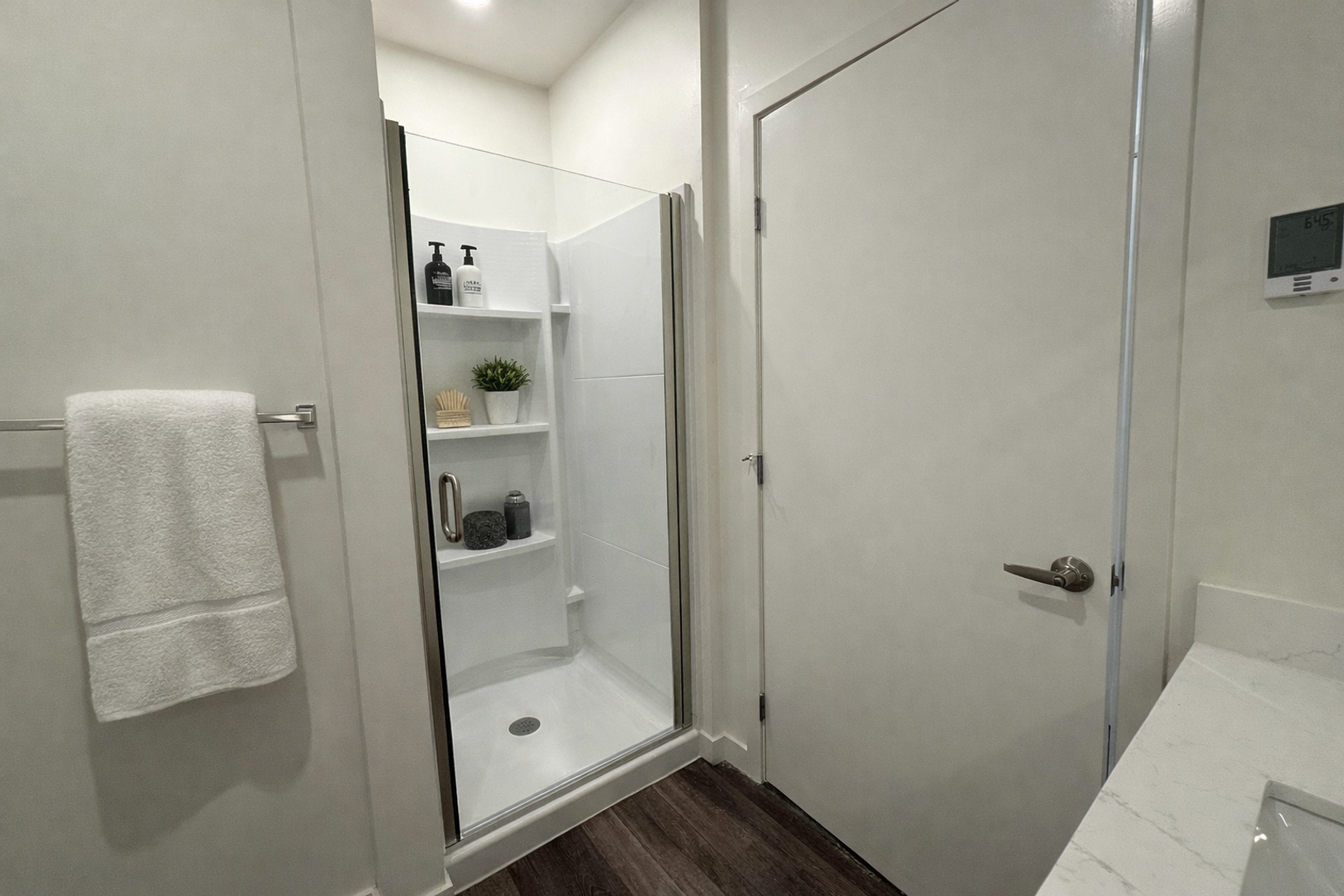 Studio apartment featuring a sleek, contemporary design, complete with polished concrete floors, quartz countertops, and large north-facing windows. Stay warm in the winter with heated bathroom flooring.