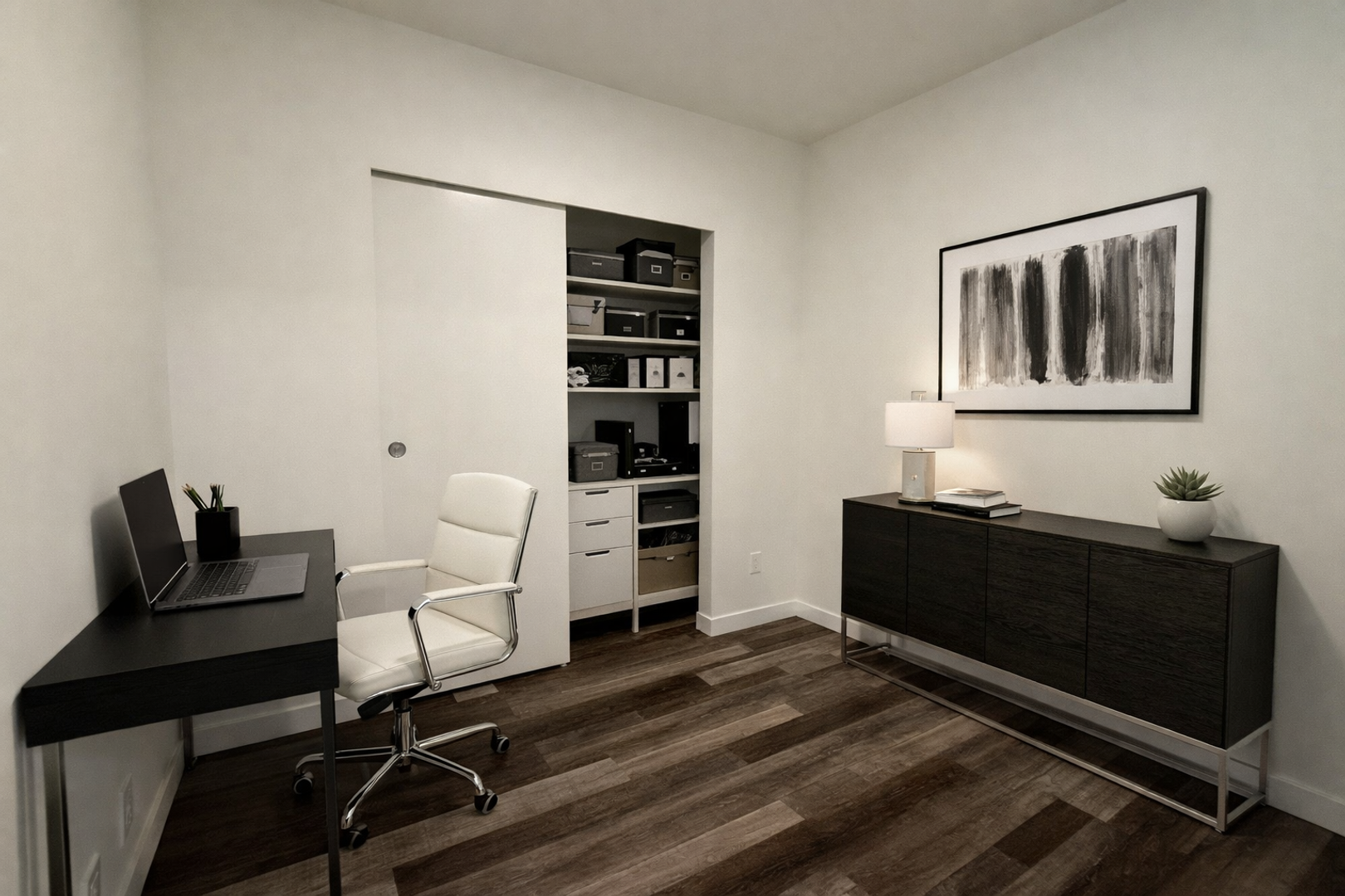 An urban 1-Bedroom apartment features a sleek, contemporary design, complete with polished concrete flooring, beautiful quartz countertops, and large west-facing windows that flood the space with natural light.
