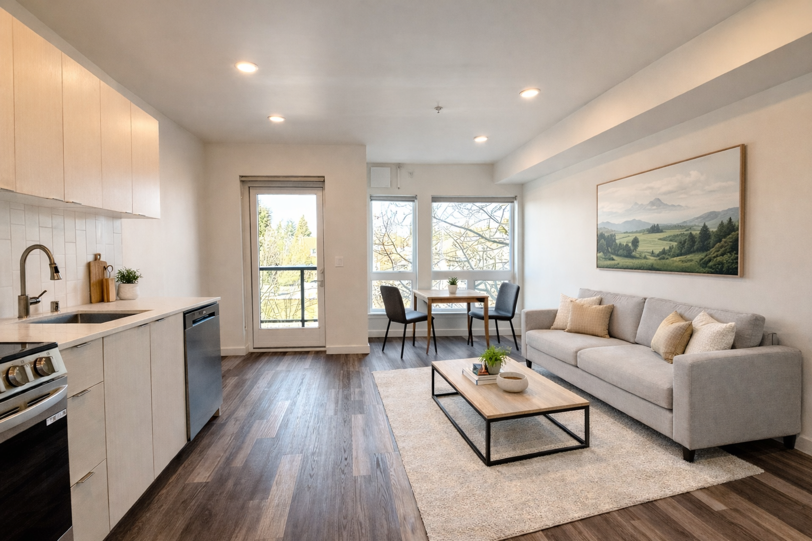Studio apartment featuring a sleek, contemporary design, complete with polished concrete floors, quartz countertops, and large north-facing windows.