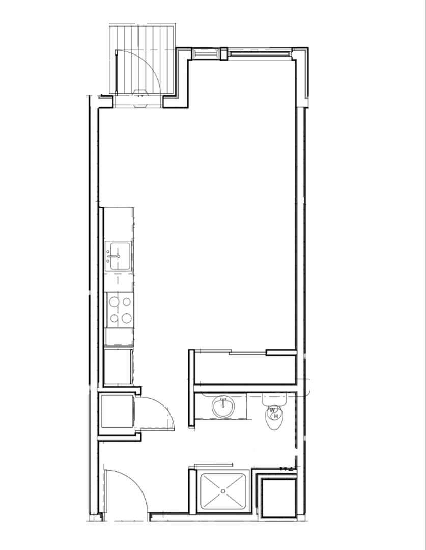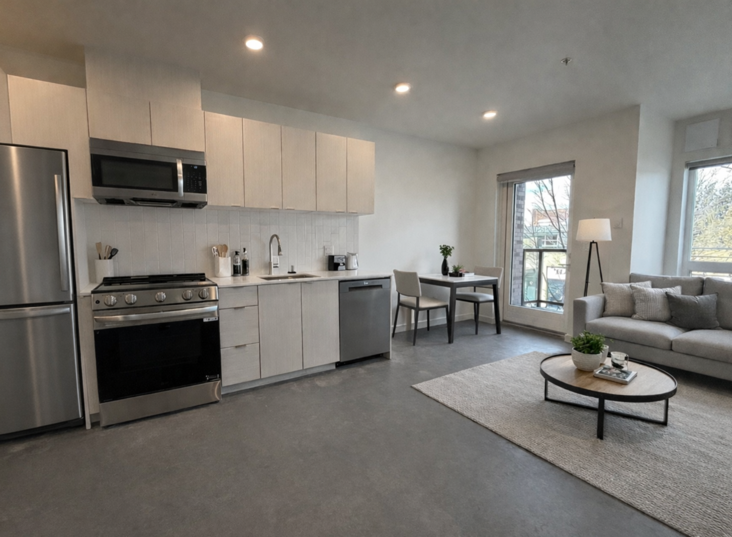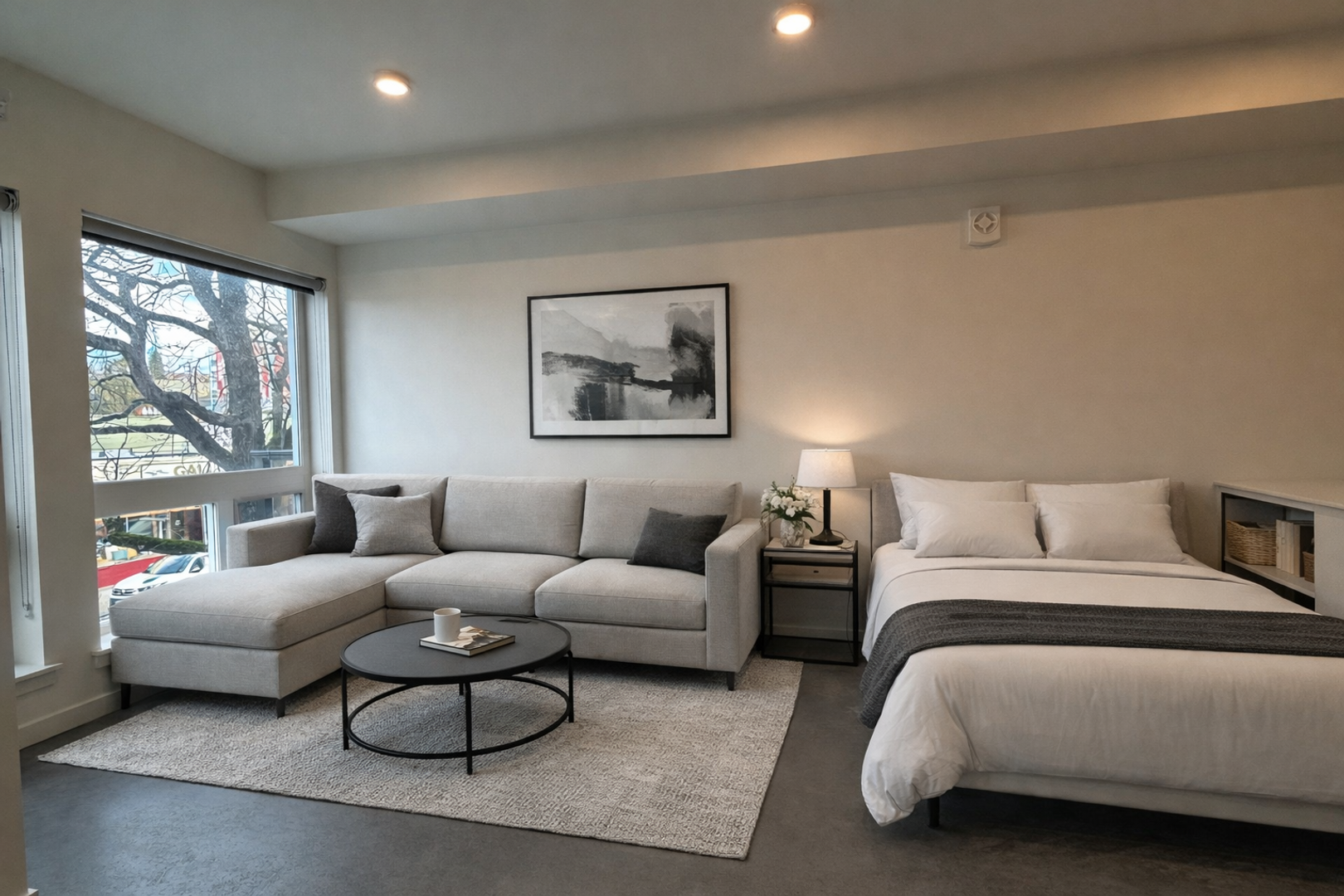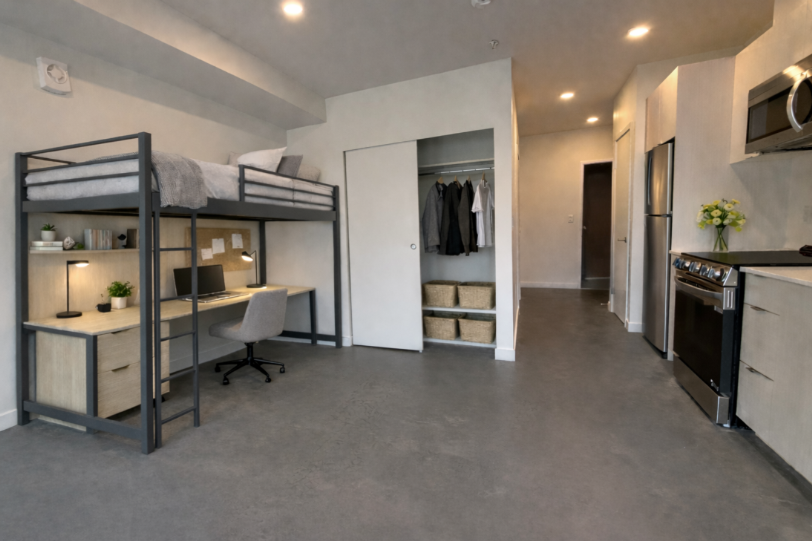 Top floor studio apartment featuring a sleek, contemporary design, complete with polished concrete floors, quartz countertops, and large north-facing windows.