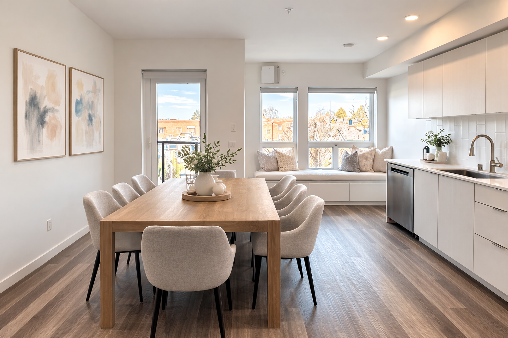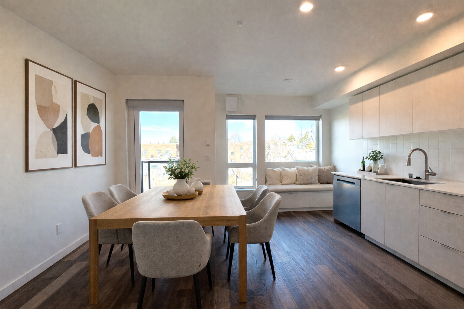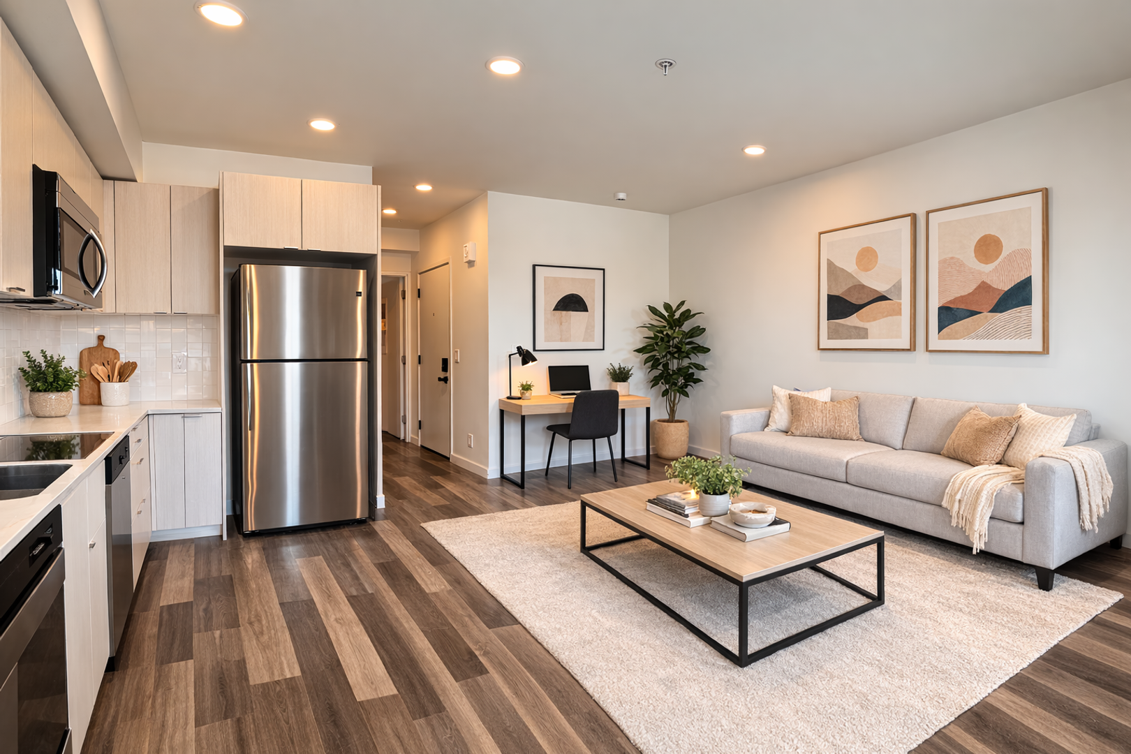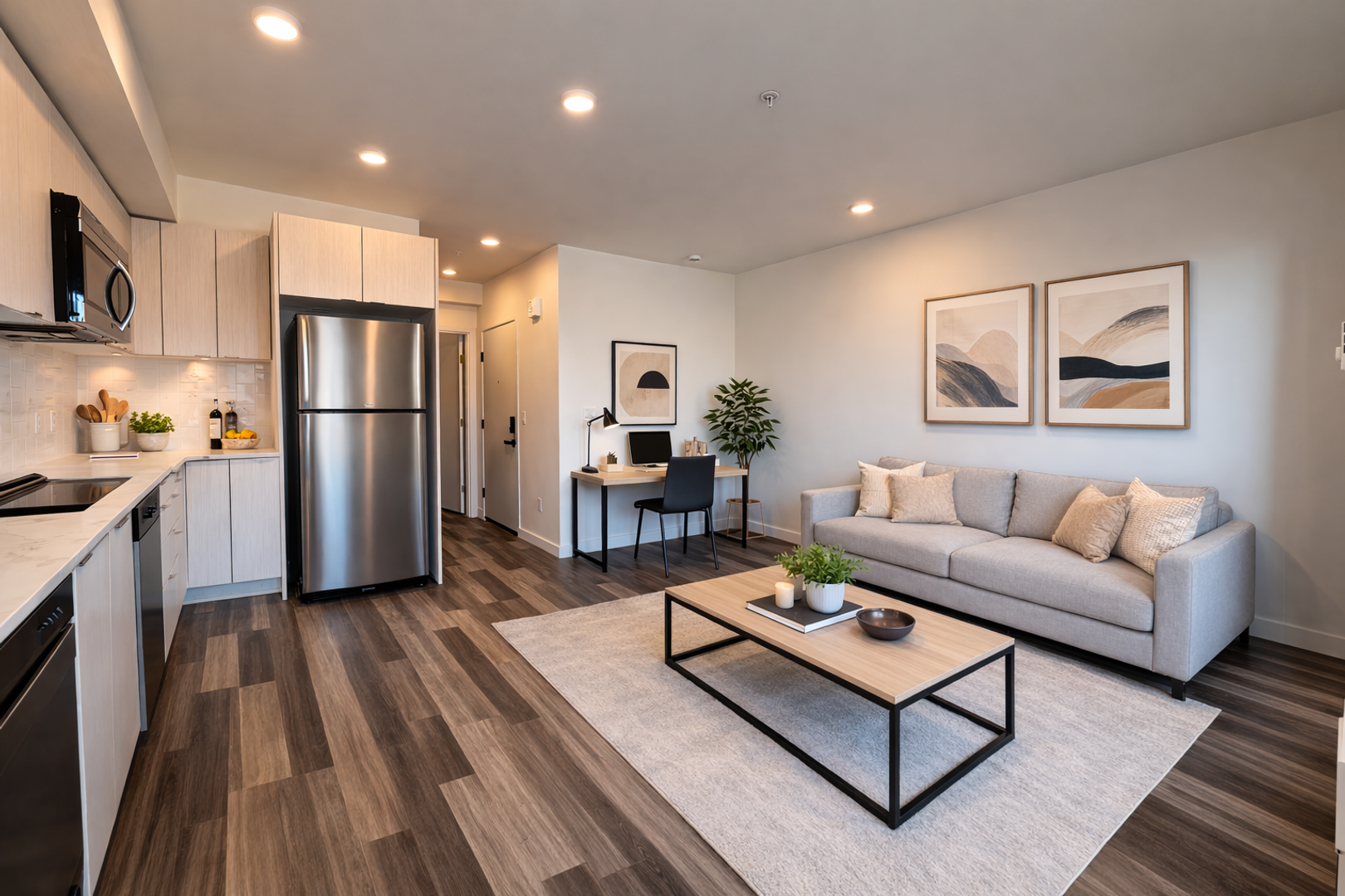 Studio apartment featuring a sleek, contemporary design, complete with polished concrete floors, quartz countertops, and large north-facing windows.