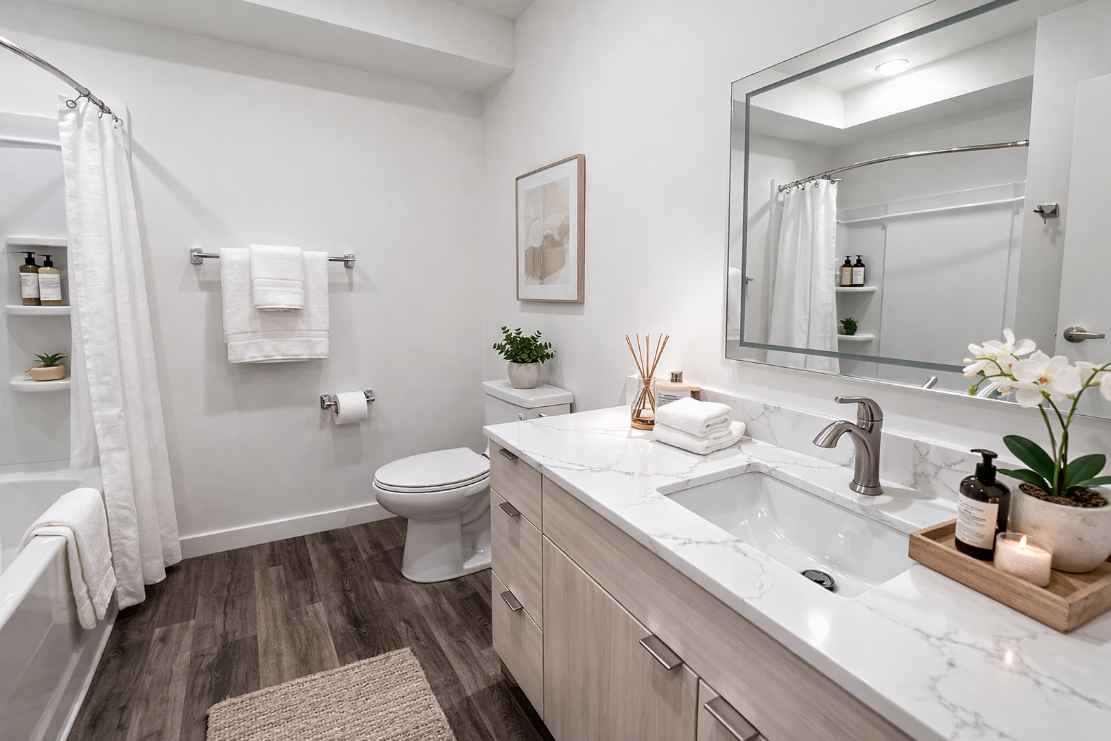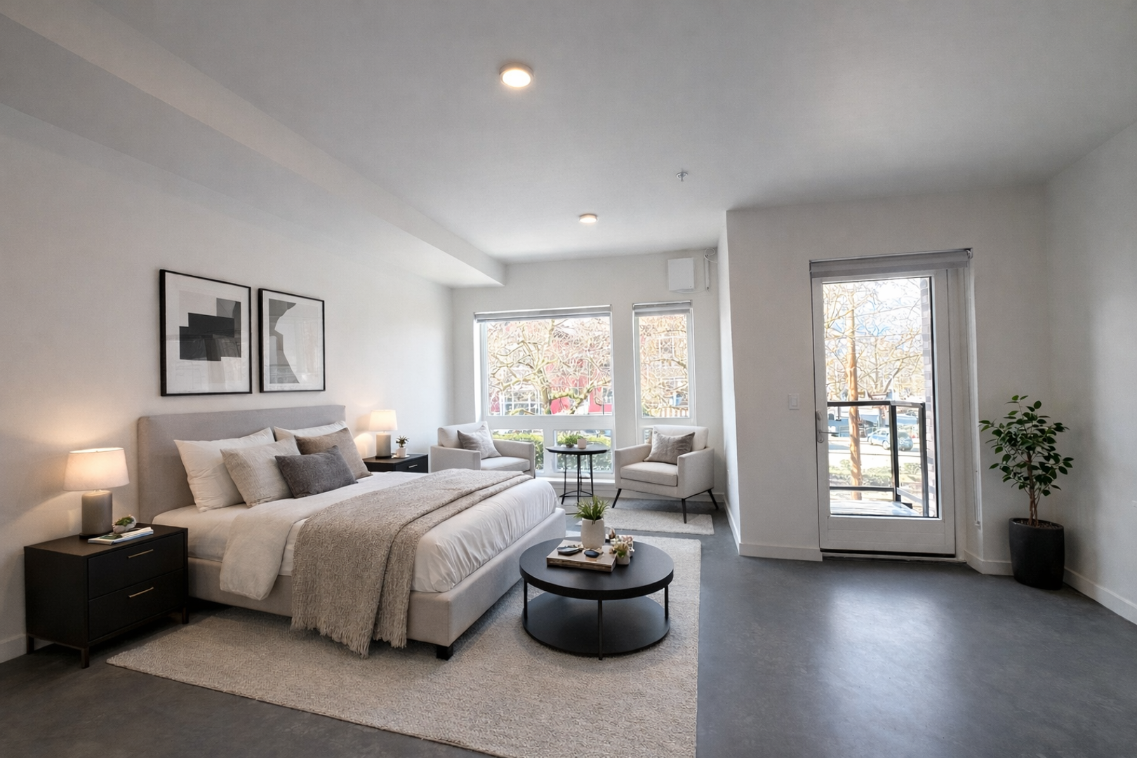 Our most spacious studio apartment features a sleek, contemporary design, complete with polished concrete floors, quartz countertops, and large west-facing windows. Stay comfortable year-round with a mini-split AC system, and heated bathroom floors.