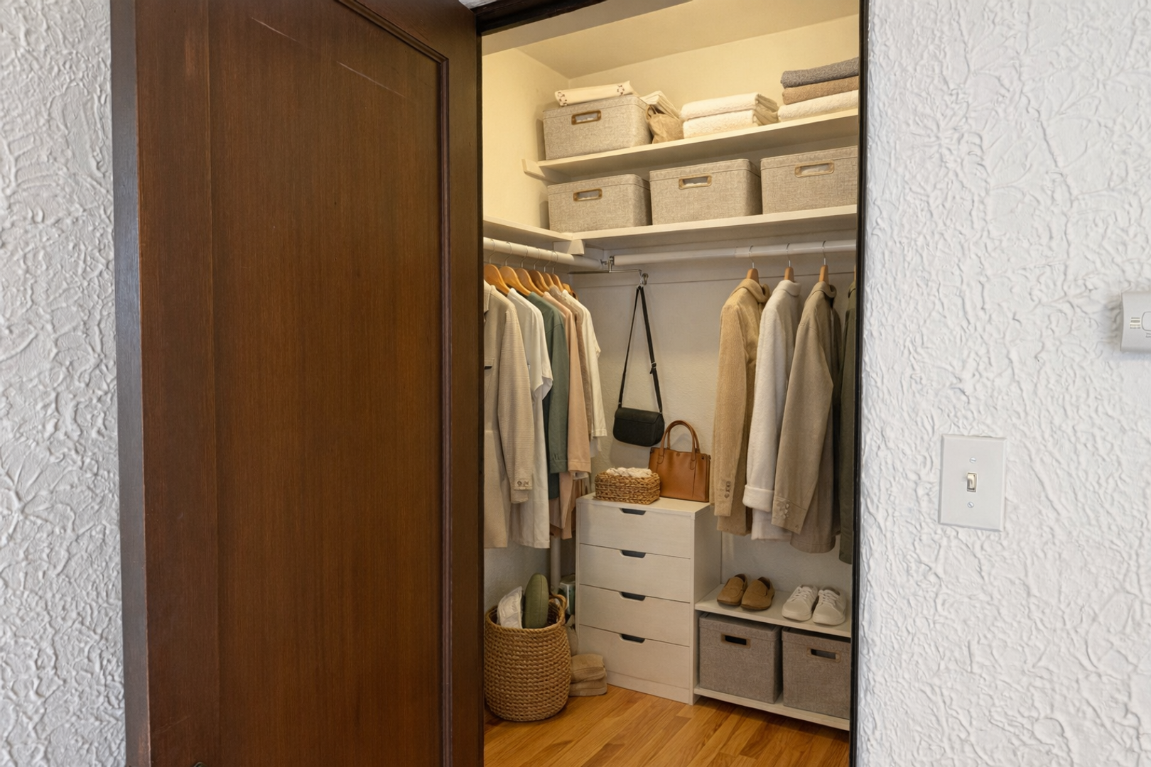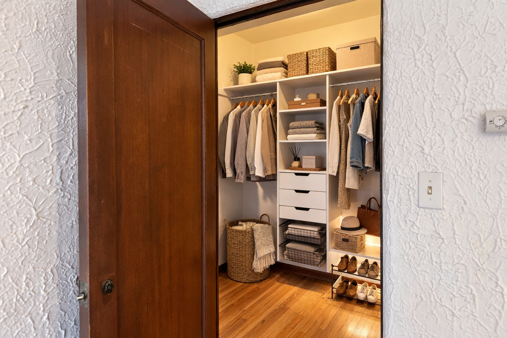 A spacious walk-in closet offers ample storage or the perfect setup for a compact home office. From the antique hardwood floors to the original period exhaust vent, this studio is full of old-world charm.