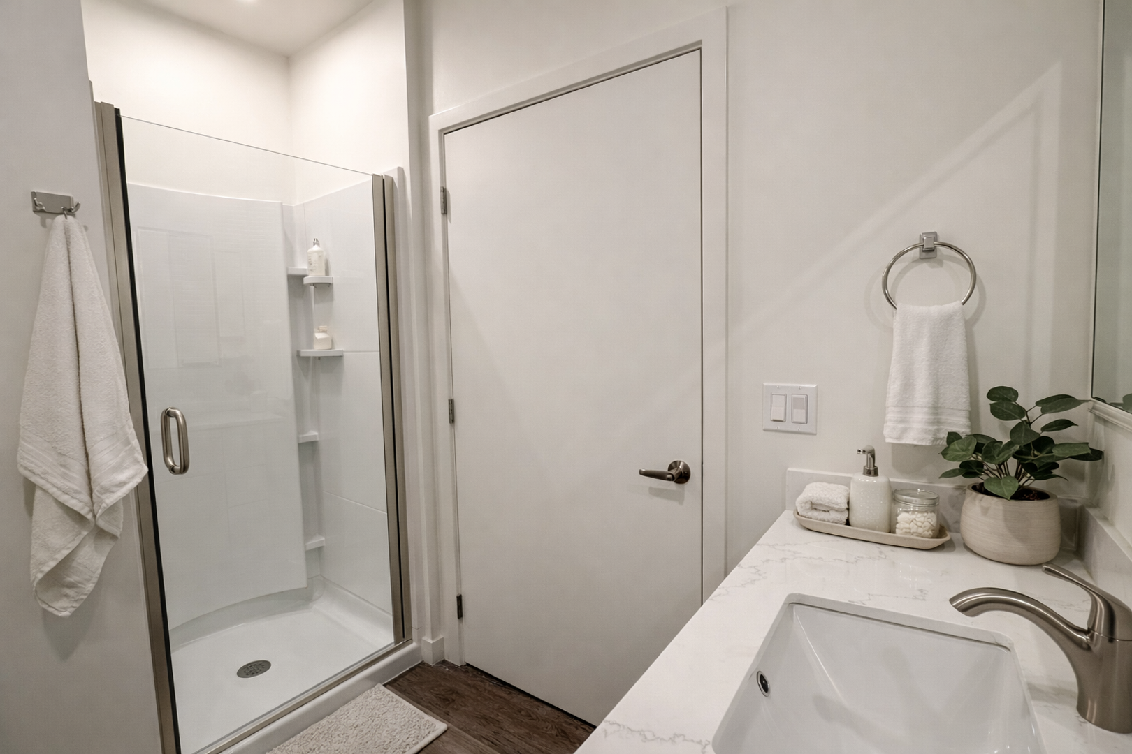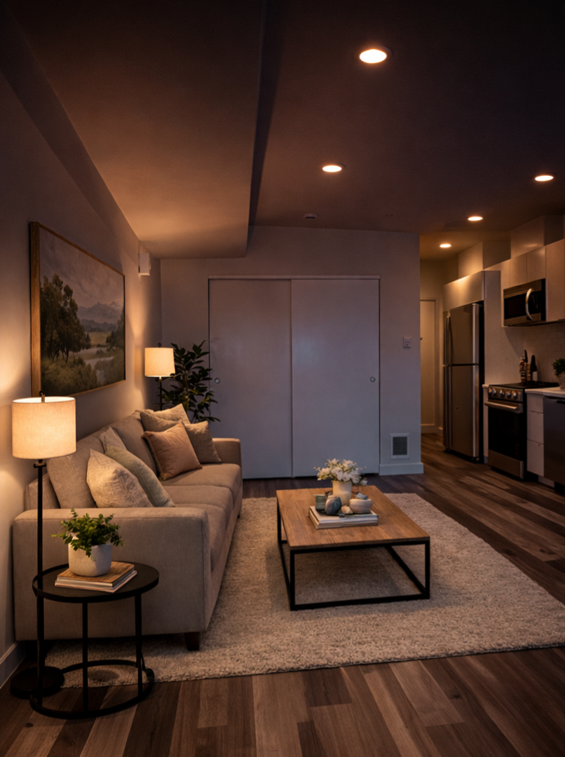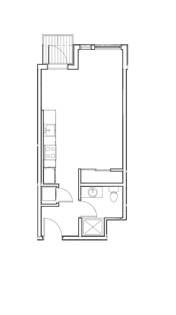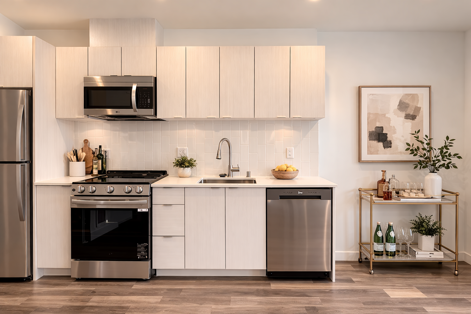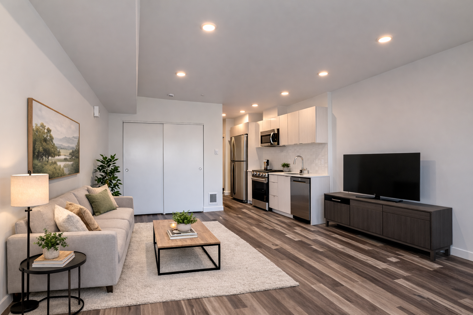 Studio apartment featuring a sleek, contemporary design, complete with polished concrete floors, quartz countertops, and large north-facing windows.