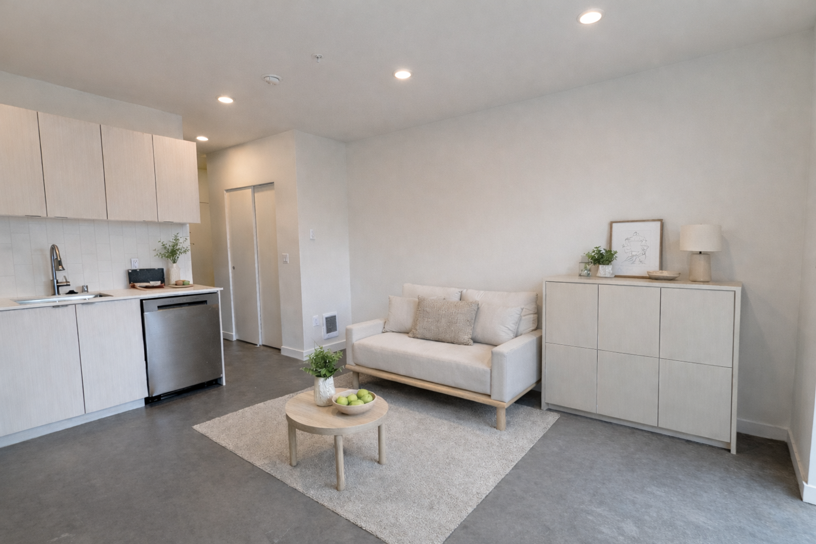 Studio apartment featuring a sleek, contemporary design, complete with polished concrete floors, quartz countertops, and a large east-facing patio. Stay warm in the winter with heated bathroom flooring.