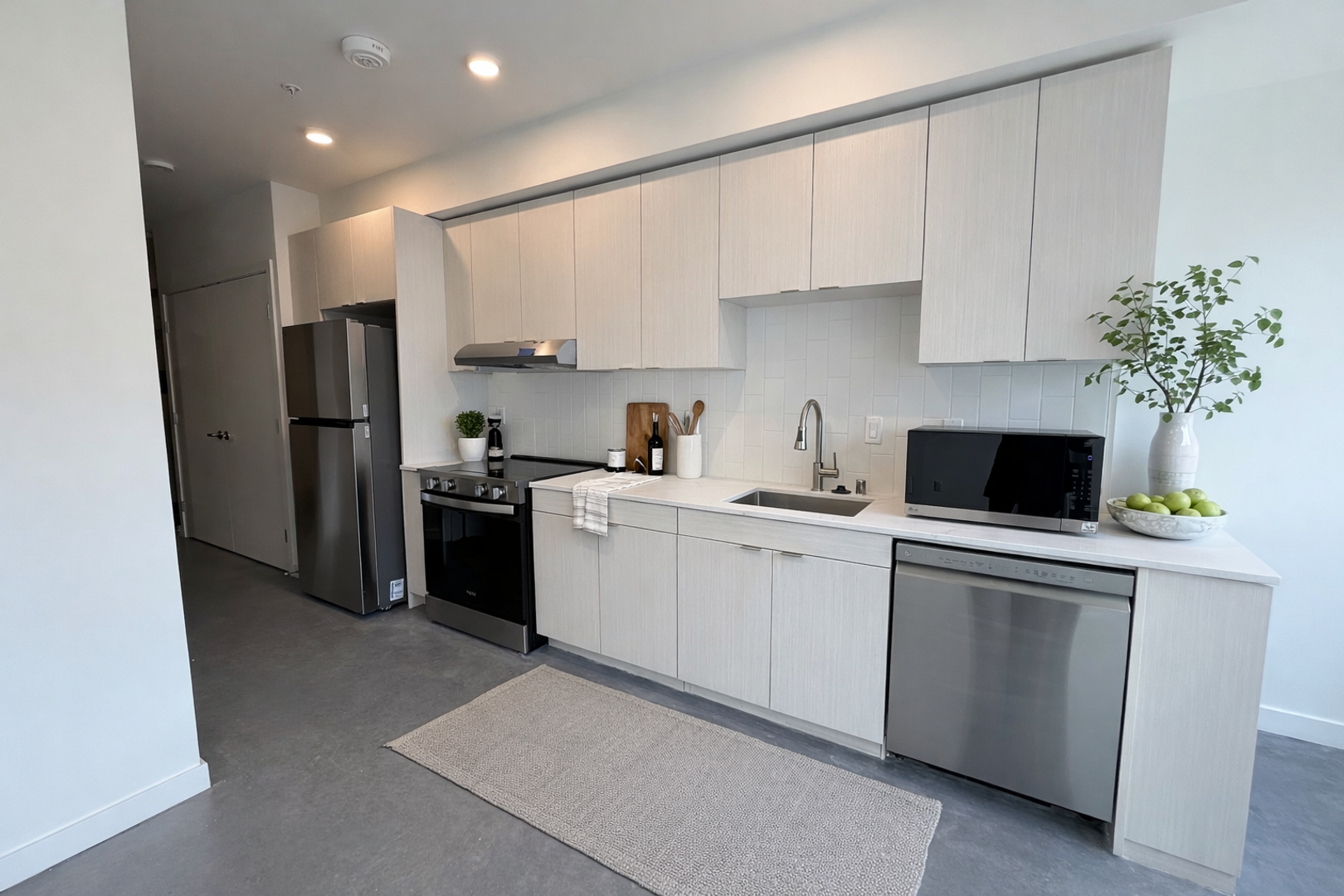 The kitchen is fully equipped with new stainless steel appliances, including a dishwasher, full-size oven/range, and refrigerator, everything you need for easy, modern living. Private balcony, ideal for enjoying neighborhood views or unwinding after a long day. For your convenience, the unit also includes an in-unit washer and dryer.