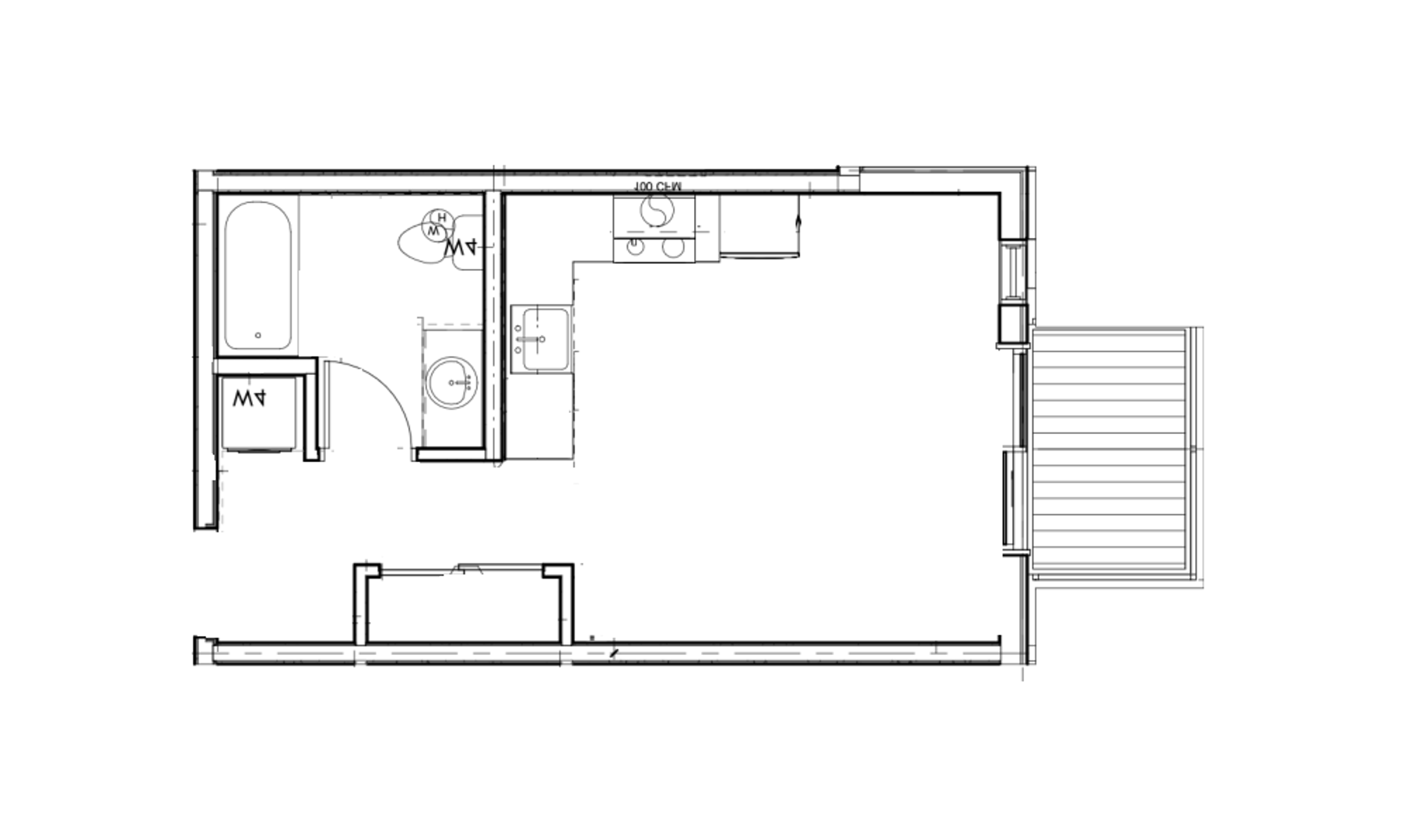Studio apartment featuring a sleek, contemporary design, complete with polished concrete floors, quartz countertops, and a large east-facing balcony.